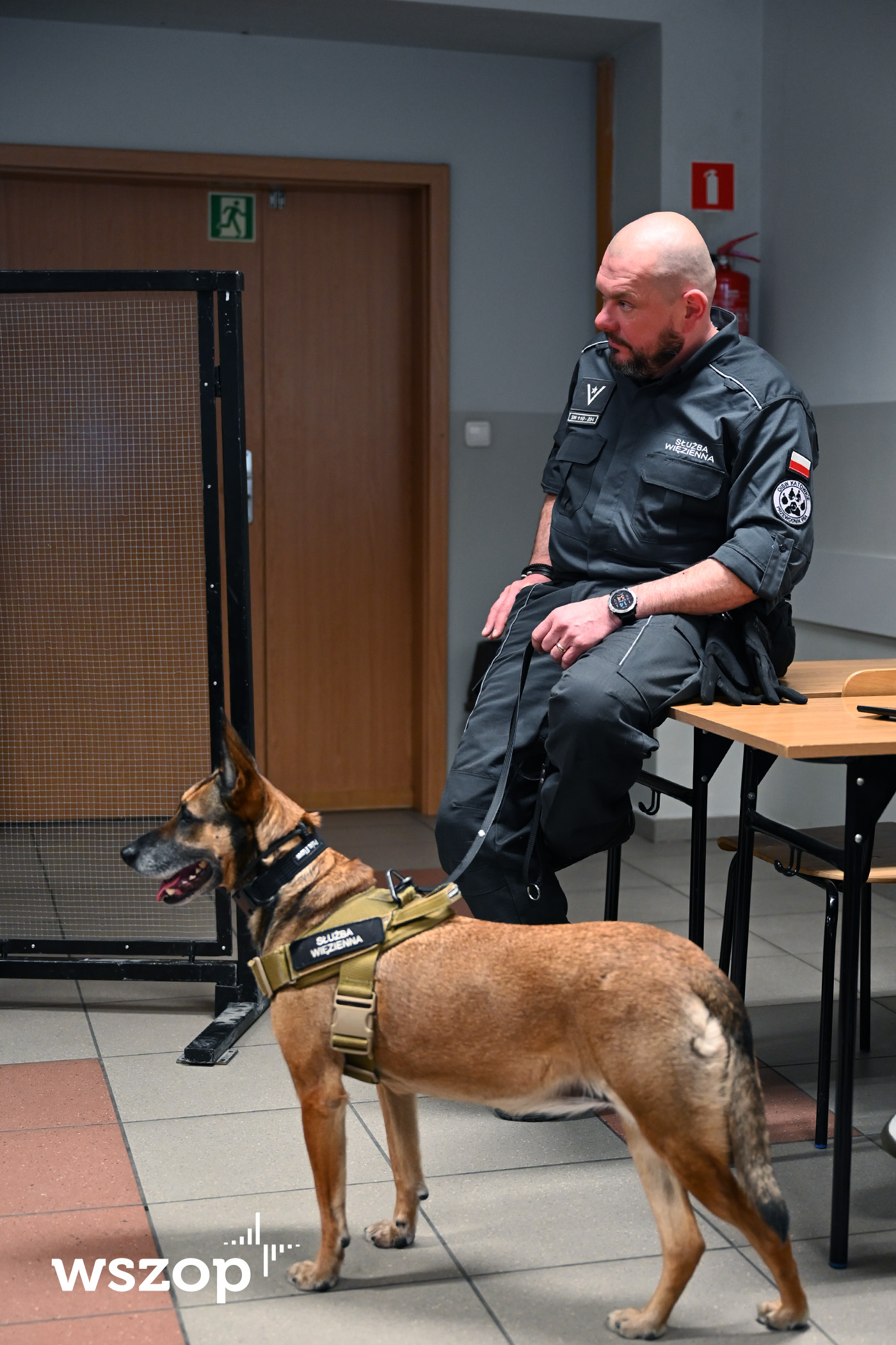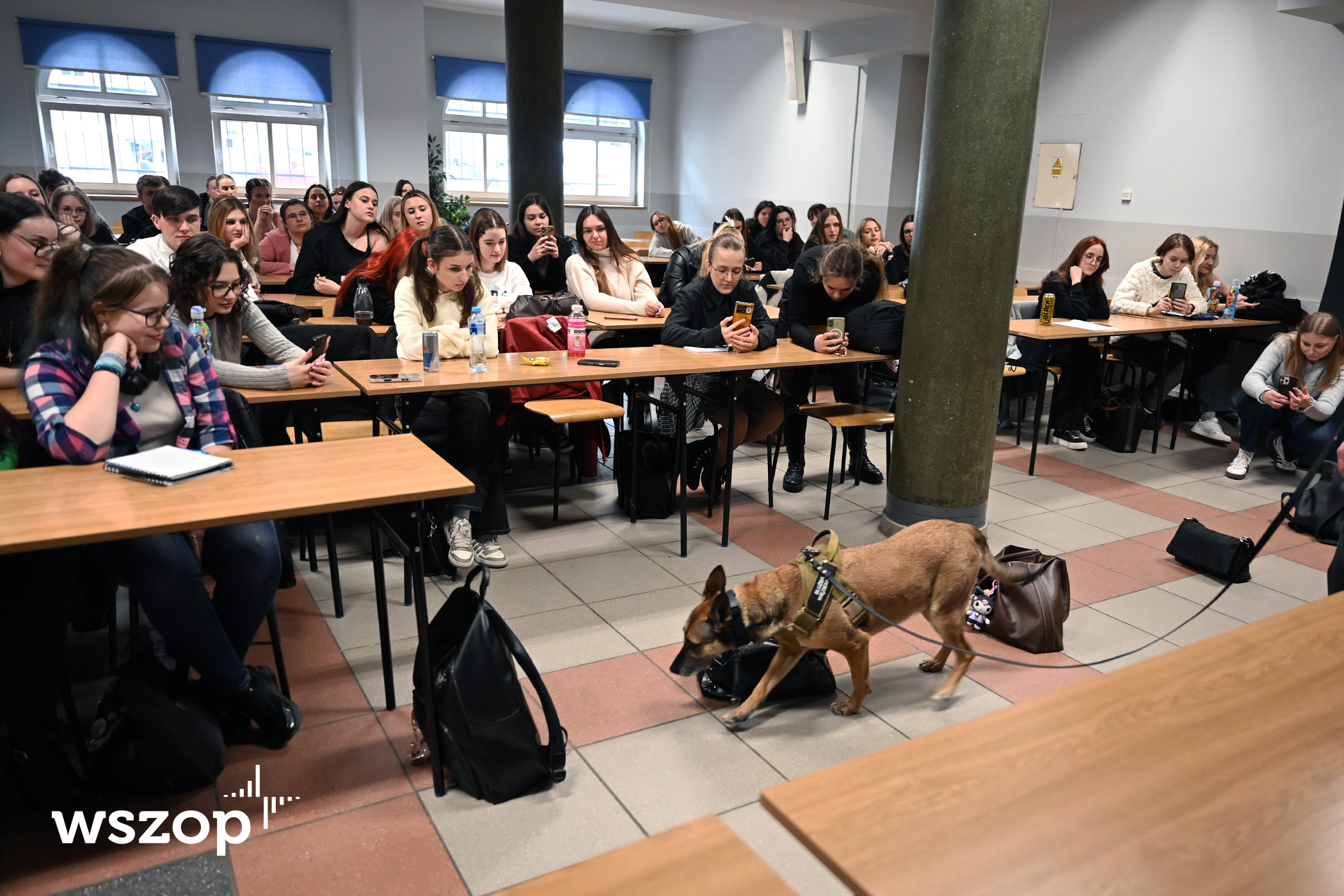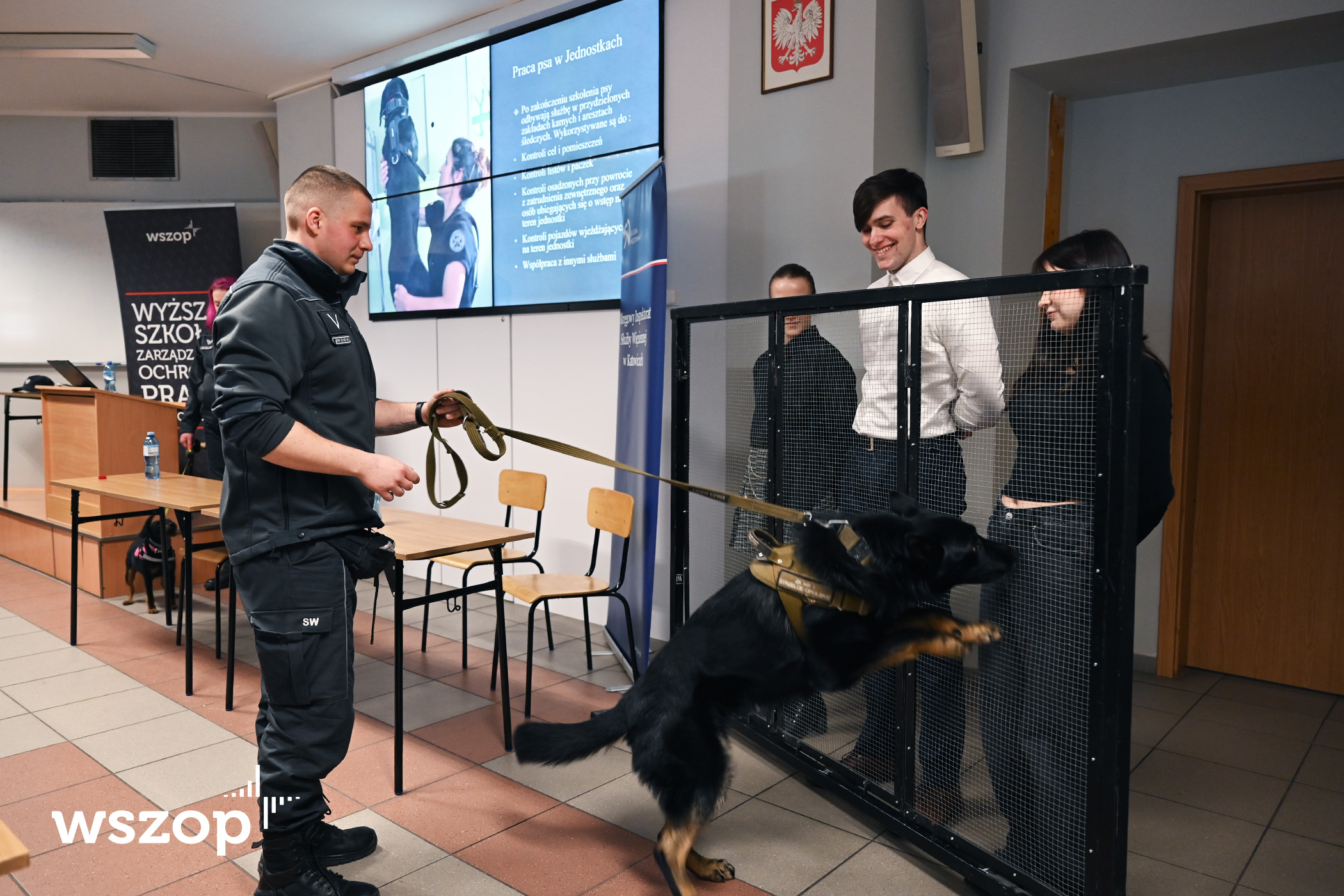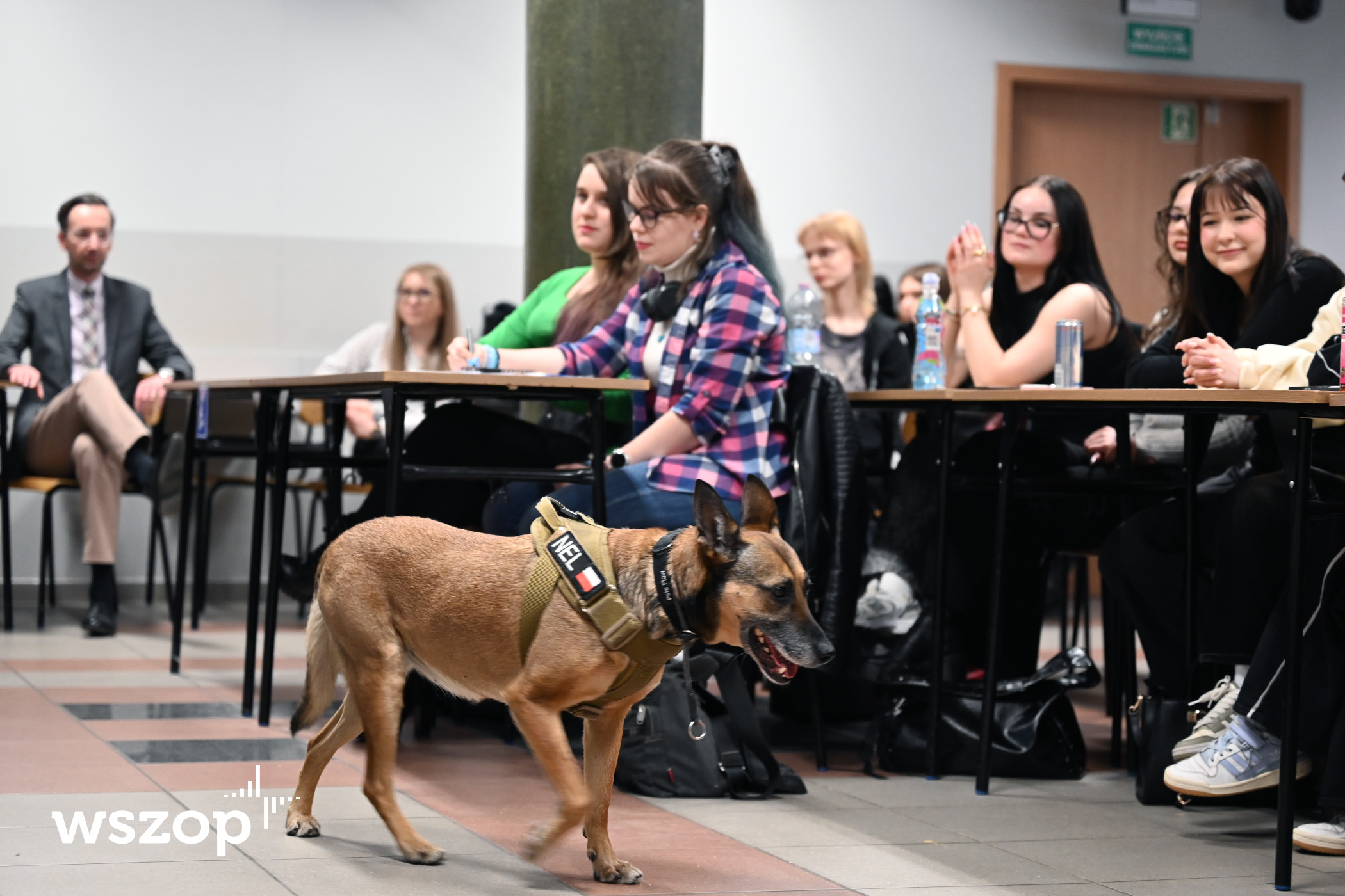 W ubiegły poniedziałek, 30 marca 2026 r. na naszej Uczelni odbyło się spotkanie poświęcone pracy przewodników psów specjalnych w jednostkach organizacyjnych służby więziennej. Wydarzenie zostało zorganizowane przez Koło Naukowe Kryminalistyki i Kryminologii WSZOP i było okazją do poznania kulis codziennej służby funkcjonariuszy oraz ich czworonożnych partnerów.