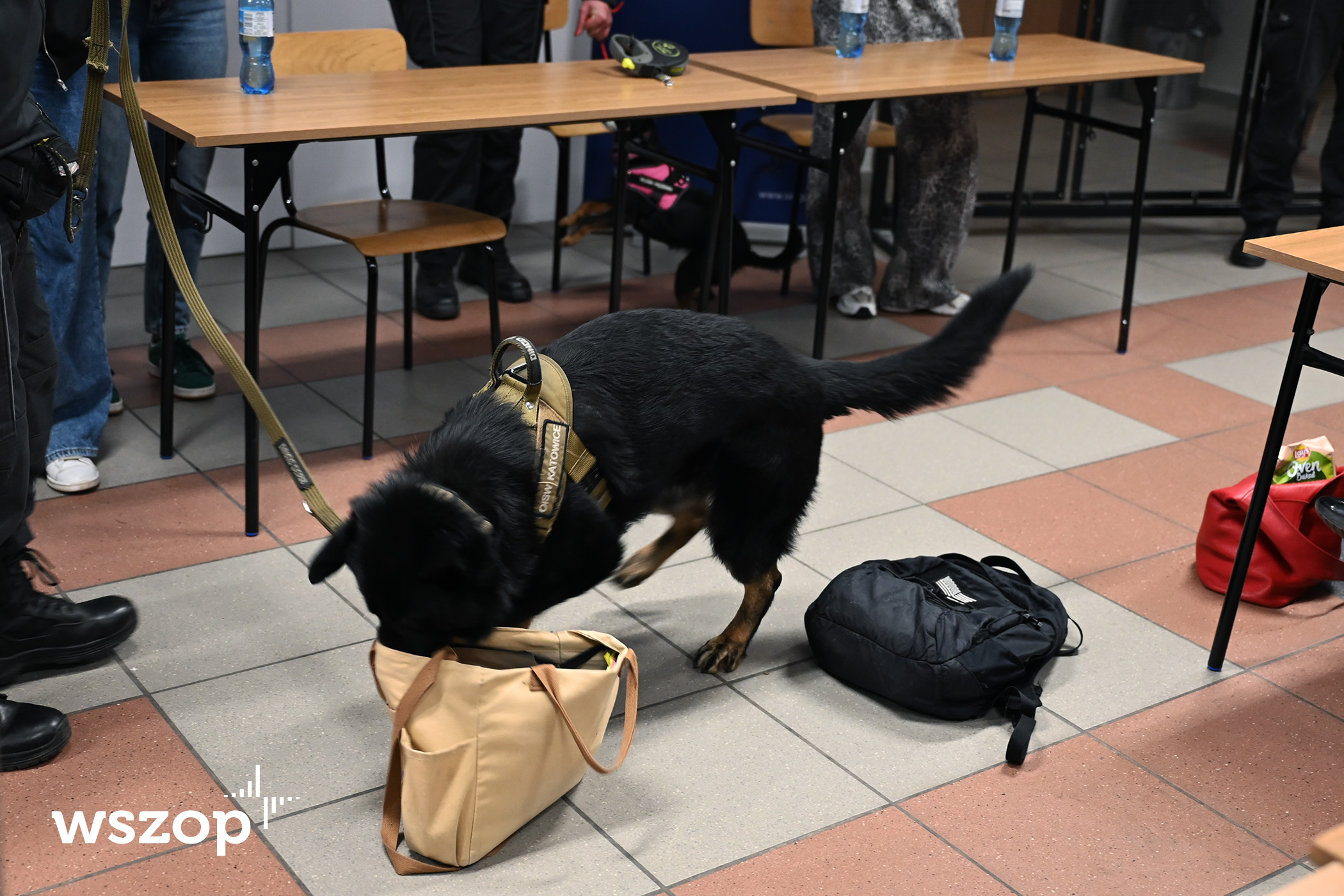 Dużym zainteresowaniem cieszyła się również praktyczna część wydarzenia – symulacja akcji z udziałem psa służbowego, podczas której zaprezentowano proces wykrywania substancji niedozwolonych.